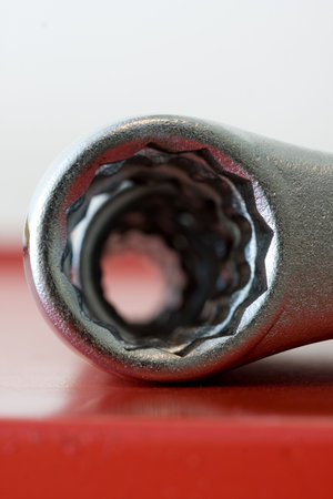 Close up of a wrench on a blue background. Shallow depth of field