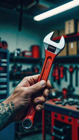 Close-up of a hand holding a metal wrench in a workshop. Blurred background features tools and shelves. Concept of repair and craftsmanship