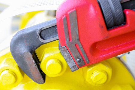 Macro view of stained pipe wrench hand tool in black greasy color