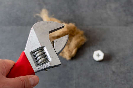 on the floor- there are wrench and plumbing linen- water seals- and water plug- close-up