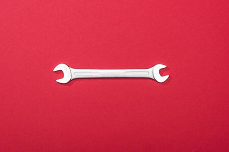 Top view of metal wrench on red background