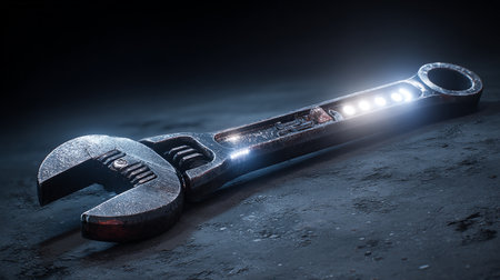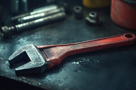 AI Generated. Close up of a rustic metal wrench on dark surface