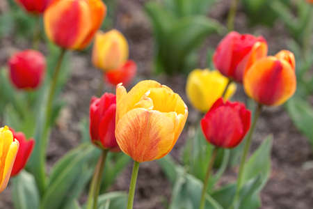 Elegant spring flower tulips on sunny day in the garden, yellow and red