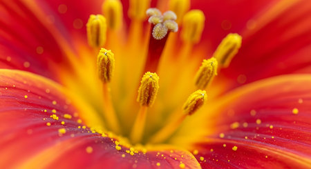 Close up of a red lily with pollen and stamens