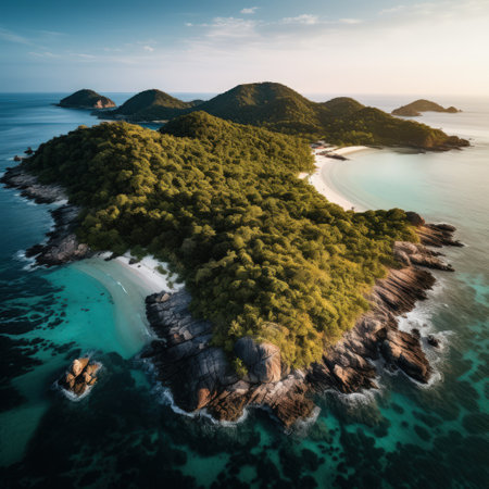 This stunning aerial image captures a remote rocky island surrounded by crystal-clear turquoise waters, showcasing the beauty of nature at sunset with peaceful vibes.