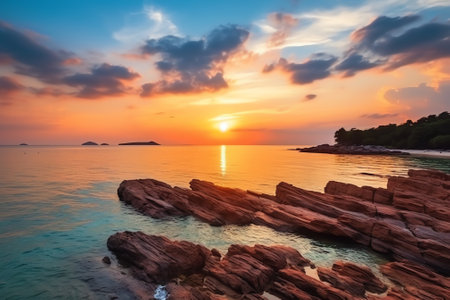 An AI generated illustration of a stunning sunset scene featuring an island in the ocean with rocky shorelines illuminated by the setting sun