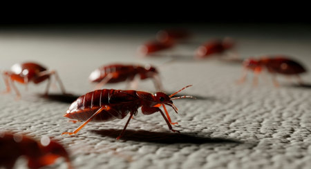 Reddish brown bed bugs, Cimex lectularius, crawl on a textured surface in a detailed macro view. This image highlights a common household pest infestation.