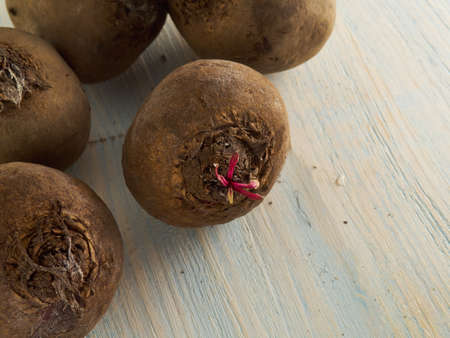 A pile of raw beets on the table. The benefits of vegetables. Harvest and natural products
