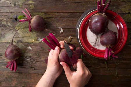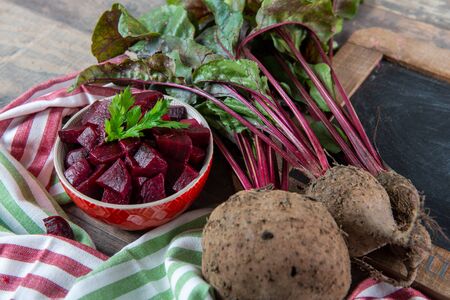 Beetroot vegetables. Horizontal flat lay on rustic kitchen with canvas bag