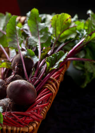Raw beetroot with herbage leaves on a dark background. banner, menu, recipe place for text, top view.