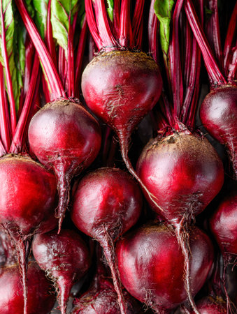 A cluster of freshly dug beetroots with intense crimson bulbs and lush green foliage, emphasizing rustic texture and rich earthy tones against a dark backdrop.
