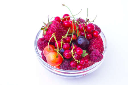 Assorted red fresh berries on a plate on a white background.