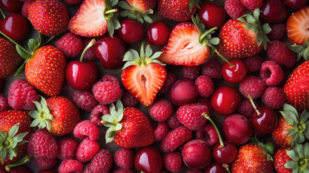 A delicious spread of red fruits, including strawberries, raspberries, and cherries