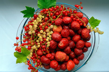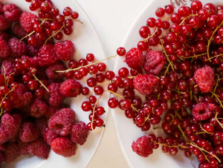 fresh red currant and raspberries photographed closeup isolated on a light blue background in high resolution image
