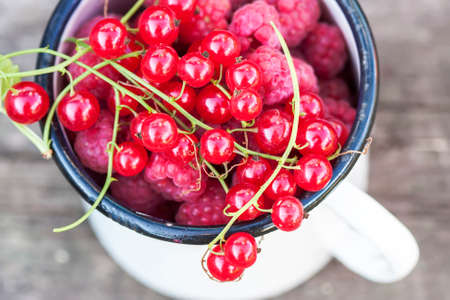 Raspberry and red currants in a bowl close-up, selective focus
