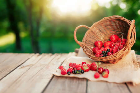 Overturned wicker basket with various berries on a piece of cloth on wooden terrace background in the blurred morning sun. Strawberry, raspberry, currant, blueberry, cherry, sweet cherries