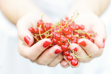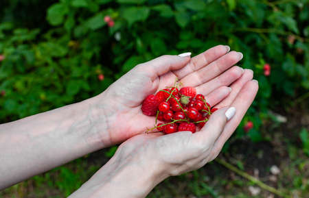 fresh red currants and raspberries in hands. High quality photo