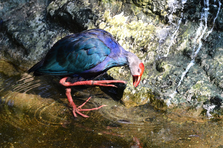 An adult Dusky Moorhen scavenging for food in a shallow pond.
