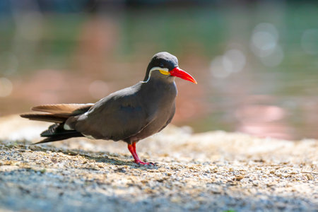 The Inca tern Larosterna inca bird has dark gray body, white mustache and red-orange beak and feet. Breeds on the coast of Peru, Chile and Ecuador South America.