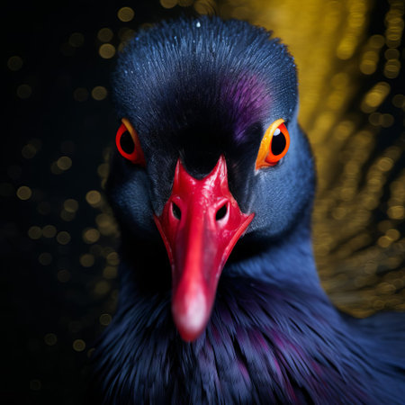 the american coot's intriguing gaze is magnificently showcased in this stunning close-up portrait, expertly captured in vibrantly surreal fashion photography, highlighting the bird's unique facial features, expressive eyes, and subtle plumage details, set against a dreamy, ethereal background. ai generated