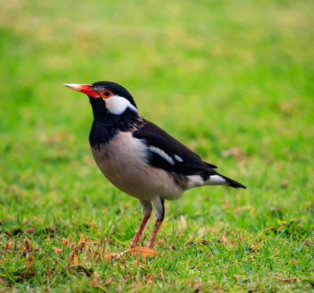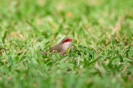Little tropical bird Common waxbill with red stripe on his eyes is foraging on the ground in green grass of the park.