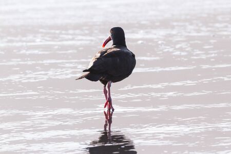 Black oystercatcher walking on wet sand in the afternoon looking for something to eat in Harris Beach State Park in the southern Oregon coast