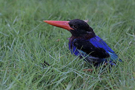 Black-capped Kingfisher, Halcyon capensis, single bird in grass, Tanzania