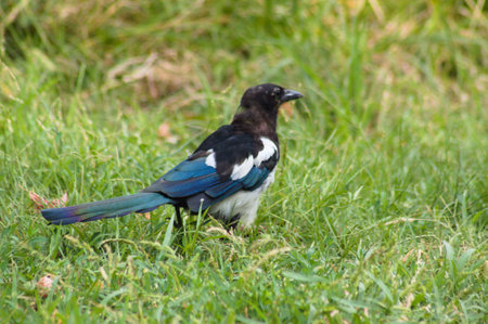 Close-up of eurasian magpie walking on grass with selective focus on foreground