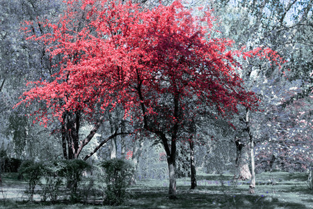 Beautiful red tree at sunset. Nature background. Vintage style.