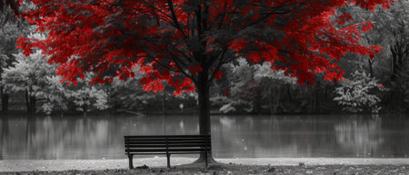 Park bench under red tree with black and white background.