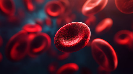 Detailed 3D rendering of red blood cells flowing through a vein. The image highlights the cells' unique shape and the blood's texture, emphasizing medical and scientific concepts.