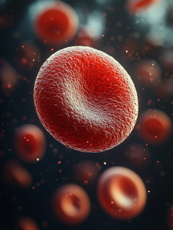 A macro view shows blood cells floating in a dark space with creative lighting highlighting their structure and details for educational purposes.