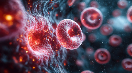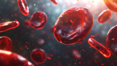 A stunning close-up illustration showcasing red blood cells drifting through a vibrant, luminous background. The dynamic lighting enhances the intricate details of cellular structures, representing fundamental aspects of human biology and health. Perfect for medical or educational use.