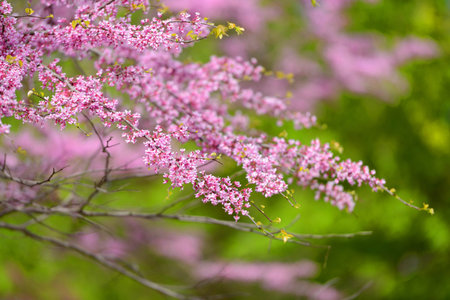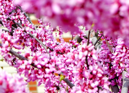 Many vivid pink flowers of Cercis siliquastrum, commonly known as Judas tree or Judas-tree, in a garden in a sunny spring day, beautiful outdoor floral background photographed with selective focus