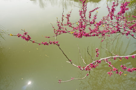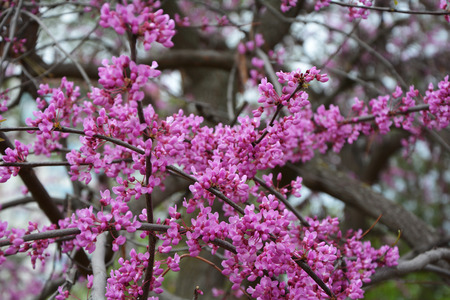 American Eastern Redbud Tree or Cercis canadensis blossoming in a park close up. Selective focus. Nature concept