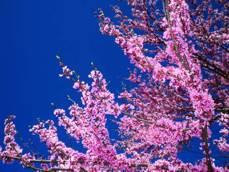 Thin branches of blossoming cercis canadensis against blue sky in mid May