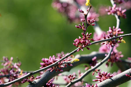 Stock photo of new growth and blooming flowers on a Redbud tree at the very beginning of the Spring season.