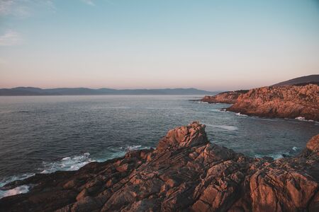 coastal cliffs by the ocean with waves. sunset.