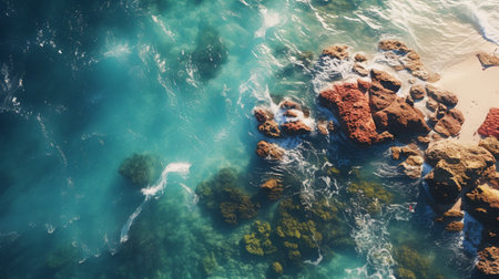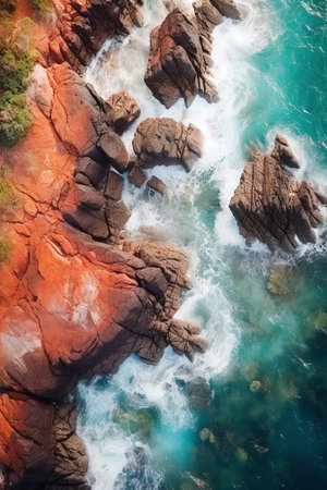 An overhead view reveals a shoreline where vibrant orange rocks meet the aqua-colored ocean. The image showcases natural textures and a gradient of colors, from the bright rocks to the darker, shadowed areas. This composition suggests a coastal environment, suitable for various commercial or editorial applications.