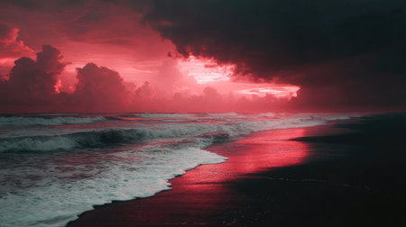 A breathtaking view of vibrant red waves colliding with a dark ocean surface captures the energy of the moment. The contrast highlights the natural beauty during twilight, evoking powerful emotions.