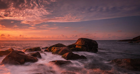 long exposure of sea and rocks and light of morning