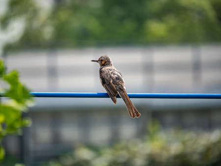 A brown eared bulbul, Hypsipetes amaurotis,perches on a utility line in Yokohama, Japan.