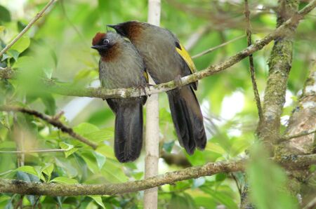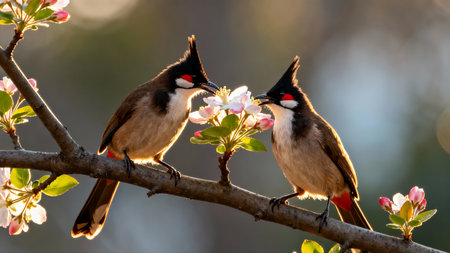 a beautiful pair of young red-whiskered bulbul (Pycnonotus jocosus), perched on a tree branch in the garden.