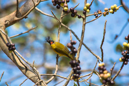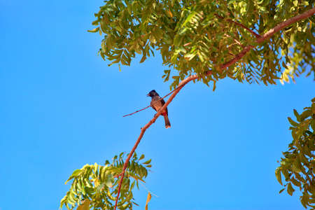 Bird, Black crest bulbul perch on a tree against blue sky