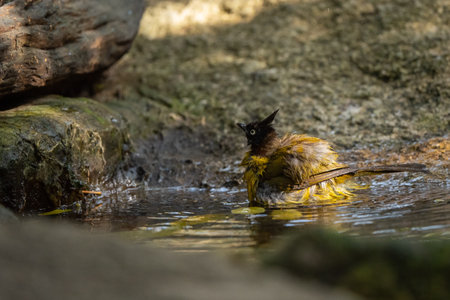 Black-crested bulbul (Pycnonotus flaviventris) lovely yellow with black crested bird about to swim in the jar pool