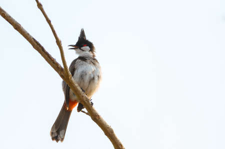 Close up Red-Whiskered Bulbul or Crested Bulbul was Perched on Branch Isolated on Blue Sky