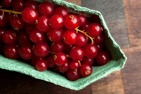 Fresh red currants on light rustic table. Healthy summer fruits.