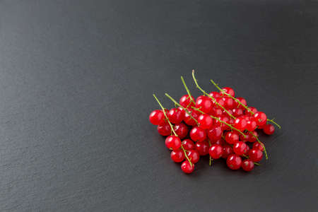 Fresh ripe red currants isolated on black slate board. Gray stone background. Front view with copy space. Studio Shot