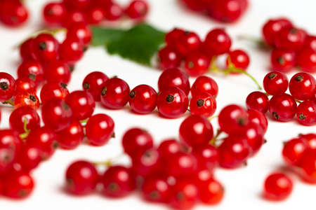 Sprigs of red currants on white. Berry background. Top view. Copy space