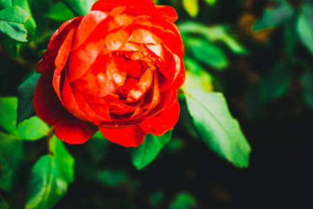 Beautiful red rose over blurred green garden background, vintage tone style, nature concept background, spring and summer garden